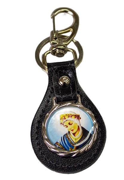 Chaveiro em couro resinado tipo mosquetão oval personalizado Nossa Senhora da Salette.