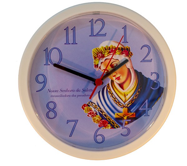 Relógio de parede maxtime, redondo nas cores azul/branco. Personalizado com a imagem da Bela Senhora de La Salette.